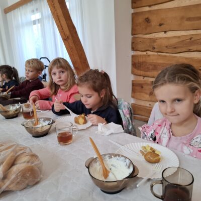 Na zakończenie dnia wszyscy zasiedli do wspólnej uczty. Dzieci własnoręcznie przygotowały regionalny przysmak – pyrę z gzikiem, który smakował wyjątkowo, bo wykonany z sercem