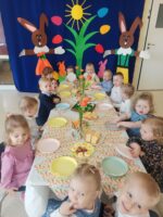 W naszym żłobku zapanowała prawdziwie świąteczna atmosfera.Z okazji świąt wielkanocnych dzieci uczestniczyły w wyjątkowym wydarzeniu-odwiedzinach zajączka oraz śniadanku wielkanocnym.Już od samego rana maluchy z radością wypatrywały niezywkłego gościa,który sprawił dzieciom ogromną niespodziankę,zostawiając dla nich kolorowe koszyczki pełne niespodzianek.Następnie odbyło się wspólne śniadanko wielkanocne.Przy pięknie udekorowanym stole mogliśmy wspólnie spędzić chwile oraz poczuć zbliżające się święta wielkanocne.
